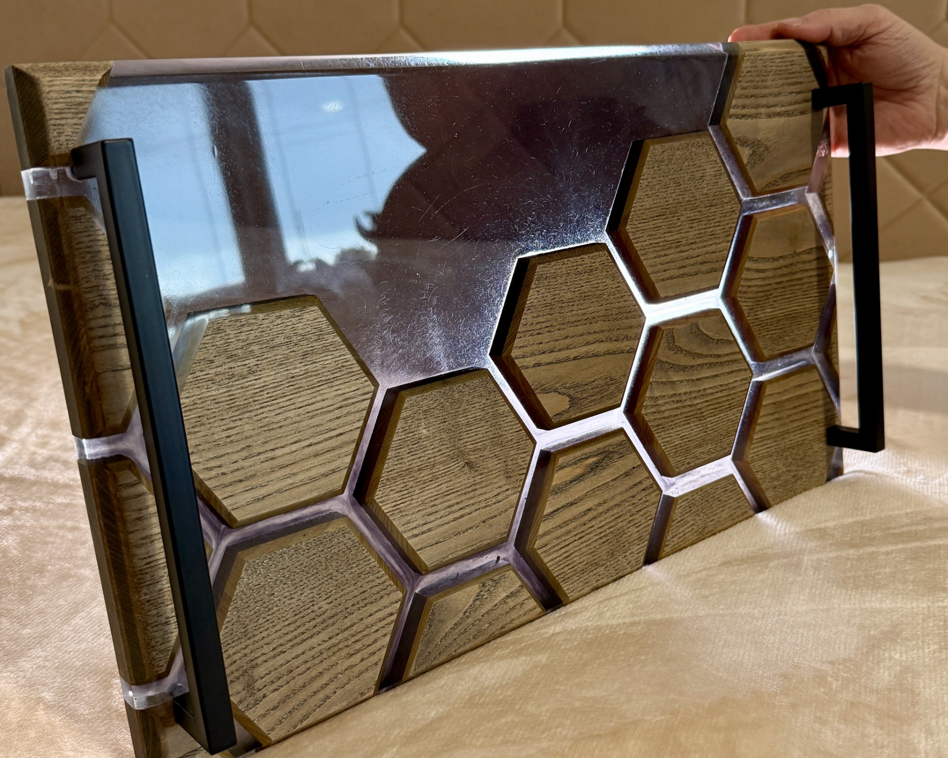 Tento jedinečný podnos spojuje moderní design epoxidu s přírodní krásou jasanového dřeva. Originální mozaika z pečlivě vyřezaných dřevěných hexagonů vytváří atraktivní vzor, který v kombinaci s průzračným epoxidem působí luxusně a nadčasově.